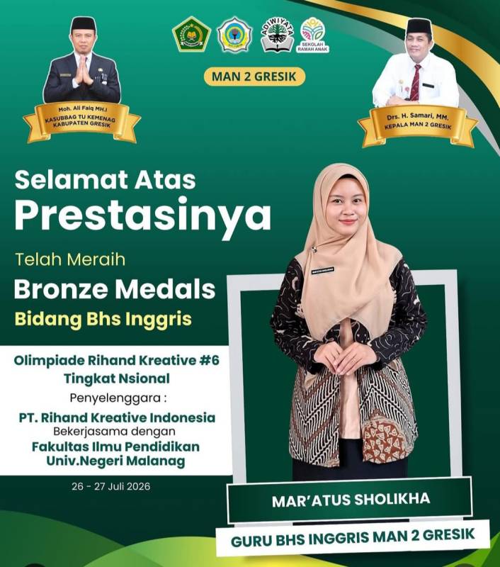 Selamat dan Sukses Prestasi membanggakan kembali diraih oleh salah satu guru hebat MAN 2 Gresik! Selamat kepada Mar’atus Sholikha, Guru Bahasa Inggris MAN 2 Gresik yang telah berhasil meraih Bronze Medali dalam ajang Olimpiade Rihand Kreative #6 Tingkat Nasional bidang Bahasa Inggris.